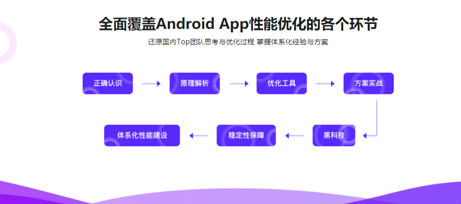 课程将从启动速度、内存、卡顿、电量、流量、瘦身等多个纬度进行原理剖析以及解决实战,同时每个章节还配备了模拟面试环节,颠覆你对性能优化的理解,最终让你的技术能力和优化经验得到前所未有的提升。