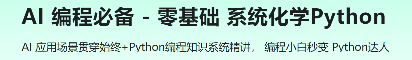 本课程专为Python编程零基础学习者设计。课程以“选题生成、PPT 自动制作、智能财务分析” 等AI应用场景驱动教学,手把手带你从0到1,边学边练,系统掌握Python语法基础、编辑器操作,文件处理、数据处理、网络编程等编程知识。同时搭配30+小案例提升编程水平,搭配工程化和代码测试技术,助力你从 “不会写代码” 到 “能用Python独立开发AI相关应用”的编程达人,快速练就职场需要的编程硬技能。