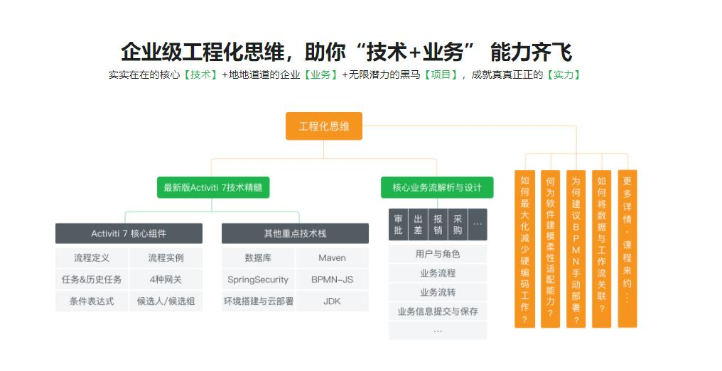 程序是有逻辑的,业务是有流程的”,讲师倾囊相授三大核心:① 以“代码驱动式”教学模式,精讲最新版工作流引擎Activiti7核心组件;② 传授你业务建模或者软件建模的“工程化思维”;③ 基于SpringBoot+Activiti+SpringSecurity 等技术栈。