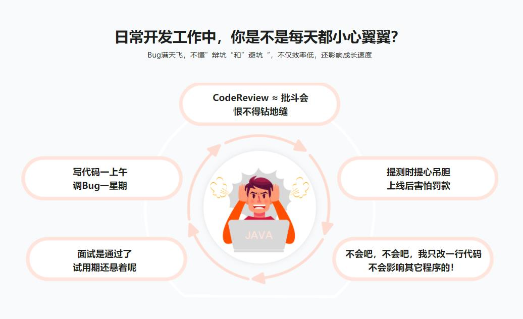 面试通过,却担心通不过试用期?明明认真做了,还是Bug满天飞?刚入行的Java开发者,总会遇到这样那样的坑。资深技术专家,调动多年经验,为你排除易出错、易被忽视、易被曲解的“坑”,根据业务需求流程,带你系统处理业务代码-整合框架-存储-缓存的常见错误,清扫知识误区。通过课程,让你对重点、难点和知识点理解更加的清晰和熟练,助力你升级打怪再上一个台阶!