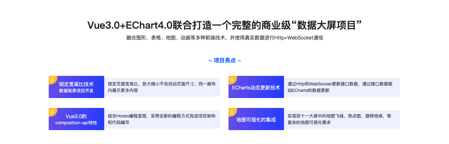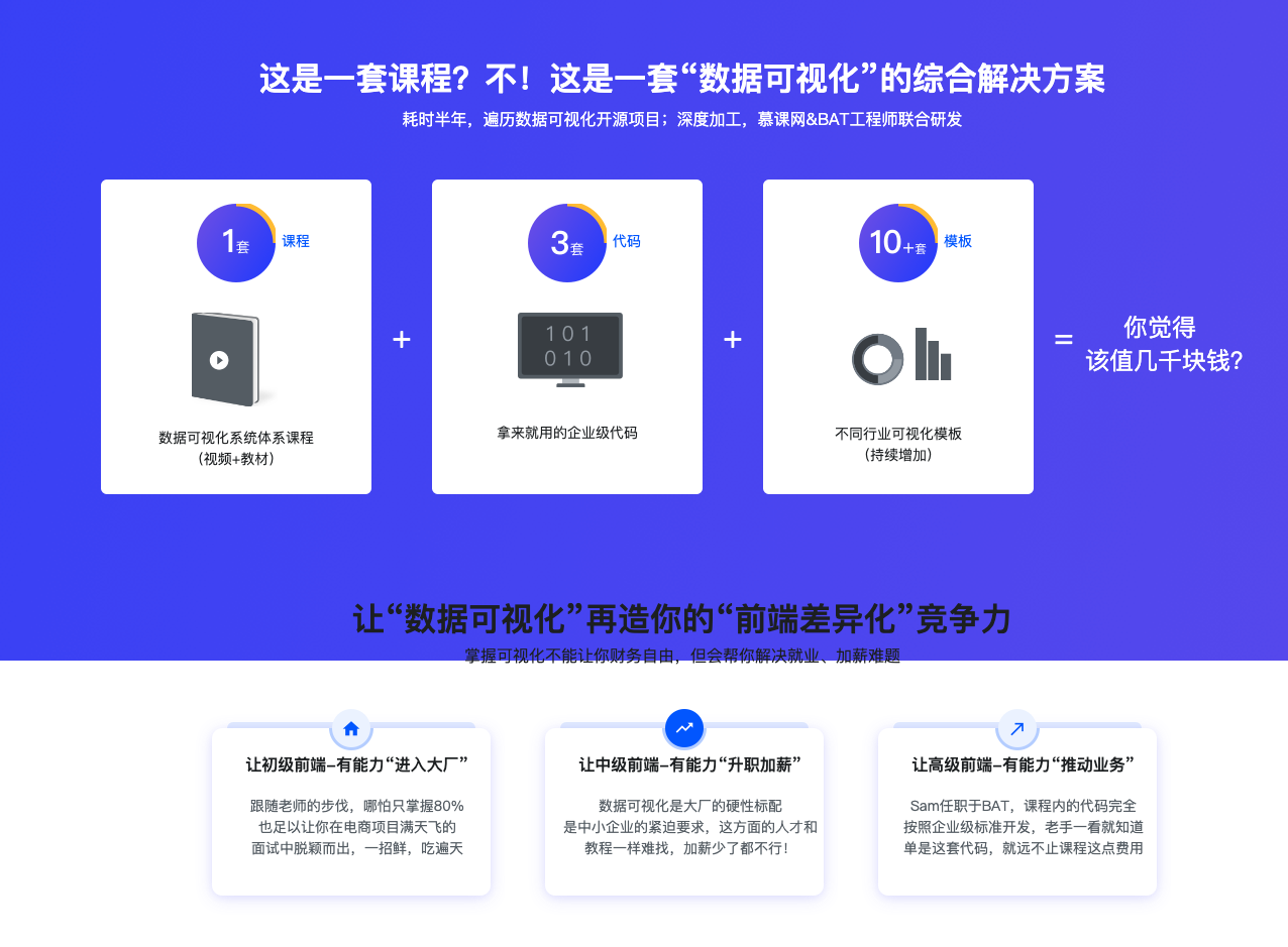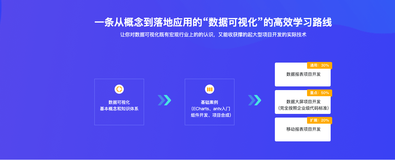 2-4 数据可视化的发展前景 (04:31)第3章 数据可视化前端技术选型(上)【不知道什么是可视化?看这里就对了】本章节,解决大家不知道如何选择技术的问题。老师带大家分析当下市面上的所有数据可视化技术,以及