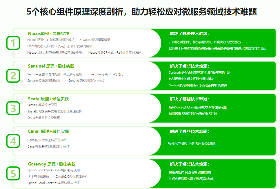 聚焦Spring Cloud Alibaba,深入剖析5大核心组件原理,并结合真实电商微服务架构,讲透框架在多场景下的最佳实践,助力全面提升微服务实战能力,轻松应对微服务领域的各种技术难题。