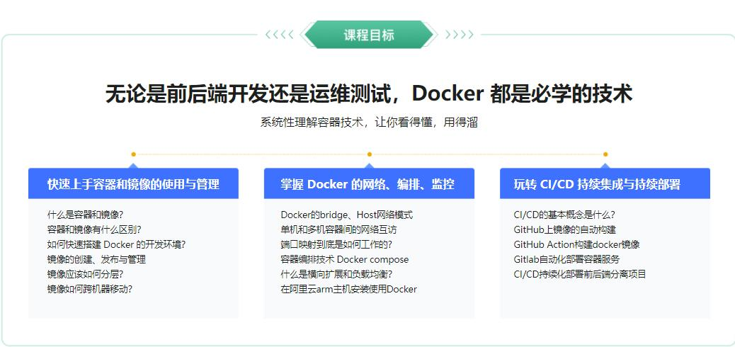 近年来,容器技术在互联网行业大火,特别是在开发和运维方向,极大地解决了规模化和灵活化部署的问题。作为容器技术的代表作 Docker 更是被广泛应用,本课程将带大家系统学习 Docker,从什么是容器,创建管理容器,到容器技术的各个细节(网络 / 存储 / 服务编排 / 监控),再到通过容器进行 CI/CD 持续集成,持续部署,彻底掌握容器技术。