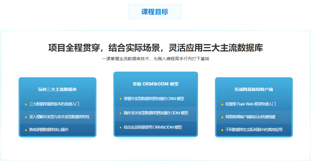 在开发中不可避免和数据库打交道,本课程专为只懂Python语法的同学准备,在逐步讲解MySQL、MongoDB、Redis 三大主流数据库基础知识的同时,带你用Python 操作三种数据库搭建一个简易的网易新闻移动端前后台,在实操实练中掌握不同类型数据库的特性,落地不同场景下数据库技术的应用。