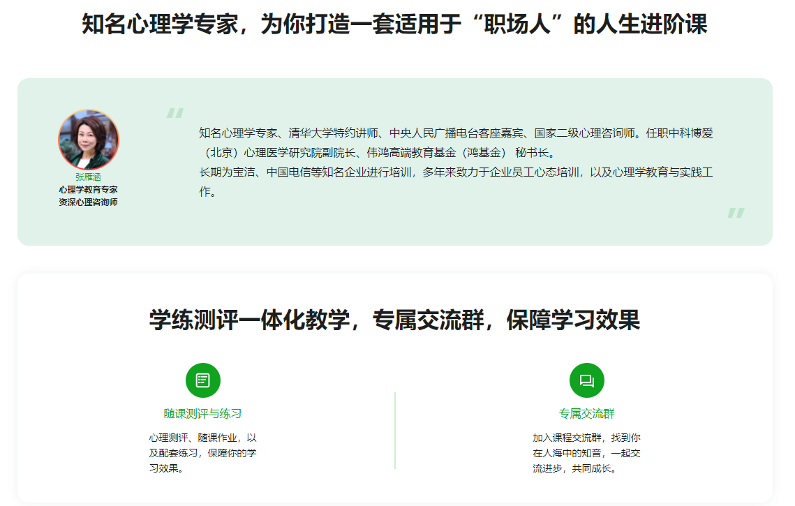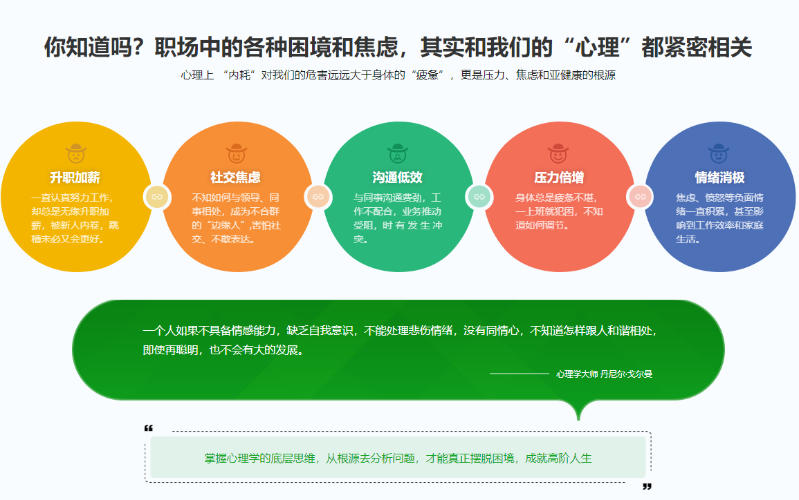 在我们职业生涯发展过程中,总会面临各种各样的困惑而无所适从,身心疲惫不堪,不利于自身职场发展。本课程我们将从心理学角度,从职业选择和升迁、健康管理、情绪管理、职场沟通、社交关系等五大方面深度解读职场常见问题,刷新你的认知,并提供科学有效、实操性强的解决方案,走出心理误区,轻松处理职场关系,开启你的职场开挂人生!