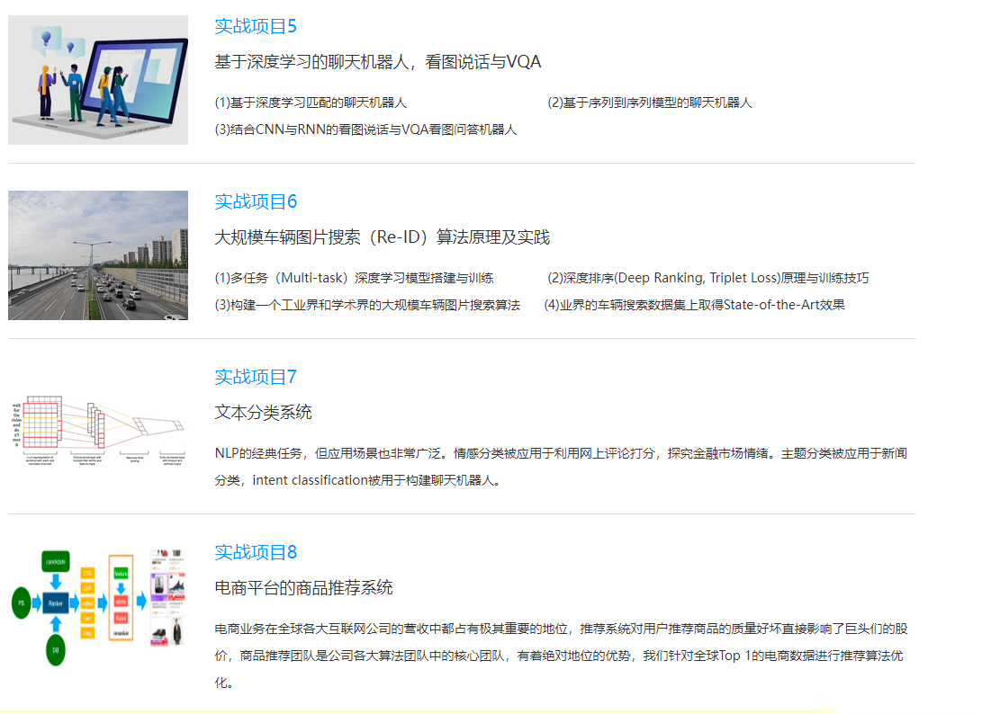 • 本深度学习集训营略过Python基础,直接从人工神经网络起步,实战BAT工业项目,并组织学员参赛,帮助学员成功就业或转行。为确保每一位学员的学习效果,本期继续维持前二期的从头到尾全部实战,但除了涵盖特征工程、以及深度学习在CV、NLP中的应用之外,特新增了以下三大模块:a.工业界业务上线/部署的大杀器——神经网络压缩技术b.新增深度学习在物体检测中的应用c.深度学习在推荐系统中的应用从而让内容更成体系、更加成熟。
