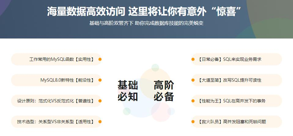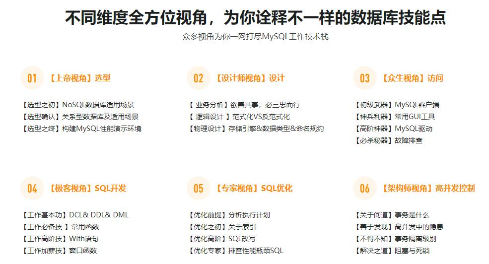 课程内容包含三方面,(1)设计之初:遵循“有教无类,教学相长”的原则;(2)学习路线:循序渐进的教学模式,带你从了解到熟悉,到掌握,最后深谙;(3)学习内容:MySQL8.0版本为内容。带你搞定SQL优化痛点问题,在工作中占据一席之地。
