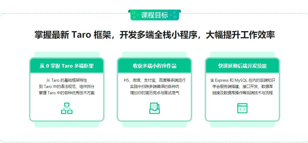 Taro3在多端的基础上,实现了跨框架,从开始的 react.JSX 开发,到现在的 React、Nerv、Vue 2、Vue 3 四种框架的支持,同时还有jQuery的支持,是我们目前多端开发的最佳选择。本课程通过一套可在微信、支付宝、百度运行的全栈小程序(包括H5端),带大家学习Taro开发,踏平多端编译的各种坑,寻求Taro中的各种优秀技术方案。