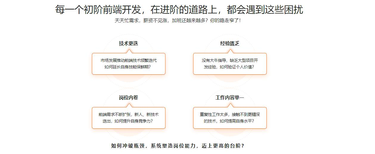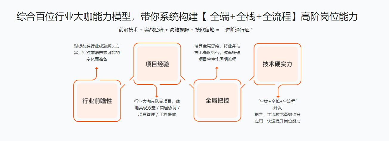 - 1个业务场景打通全端、全栈、全流程,实现全局思维与综合技术能力全面突破;对标阿里P6,8个月成为前端高级人才