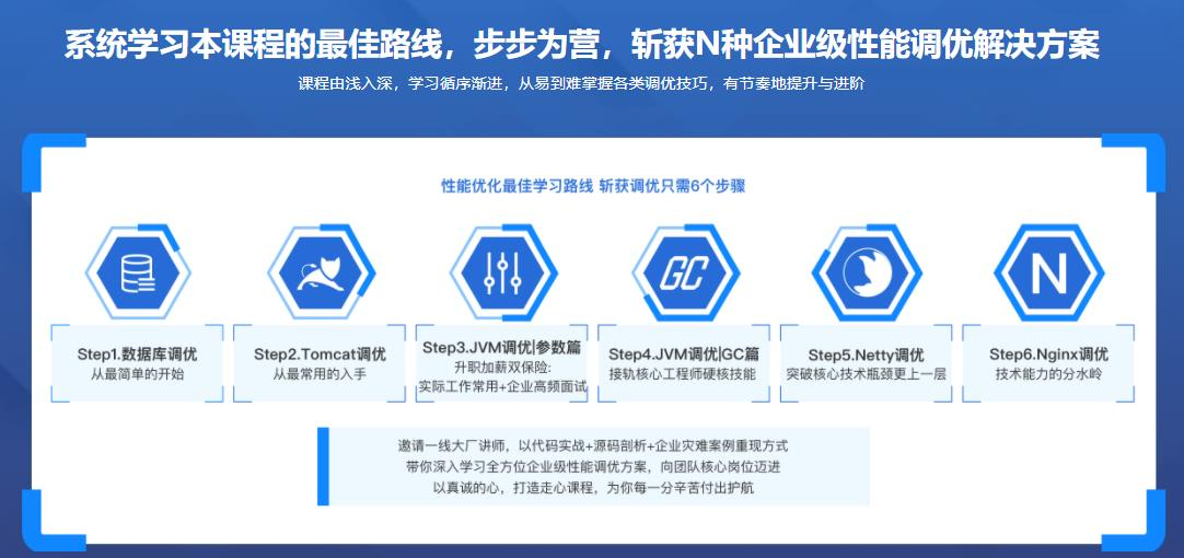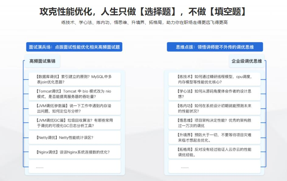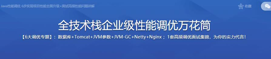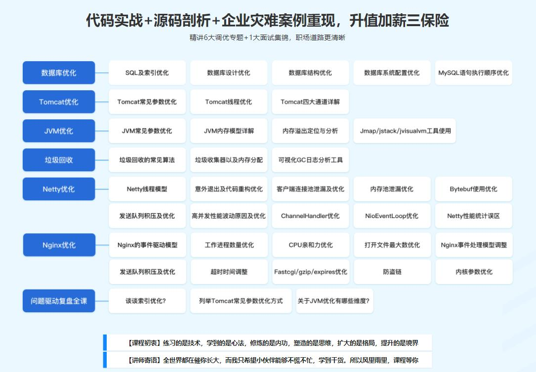 性能优化的N种企业级解决方案,囊括了【数据库优化】、【Tomcat优化】、【JVM优化】、【垃圾回收】、【Netty优化】、【Nginx优化】、【性能优化高频面试集锦】6大专题+1项面试调优复盘。