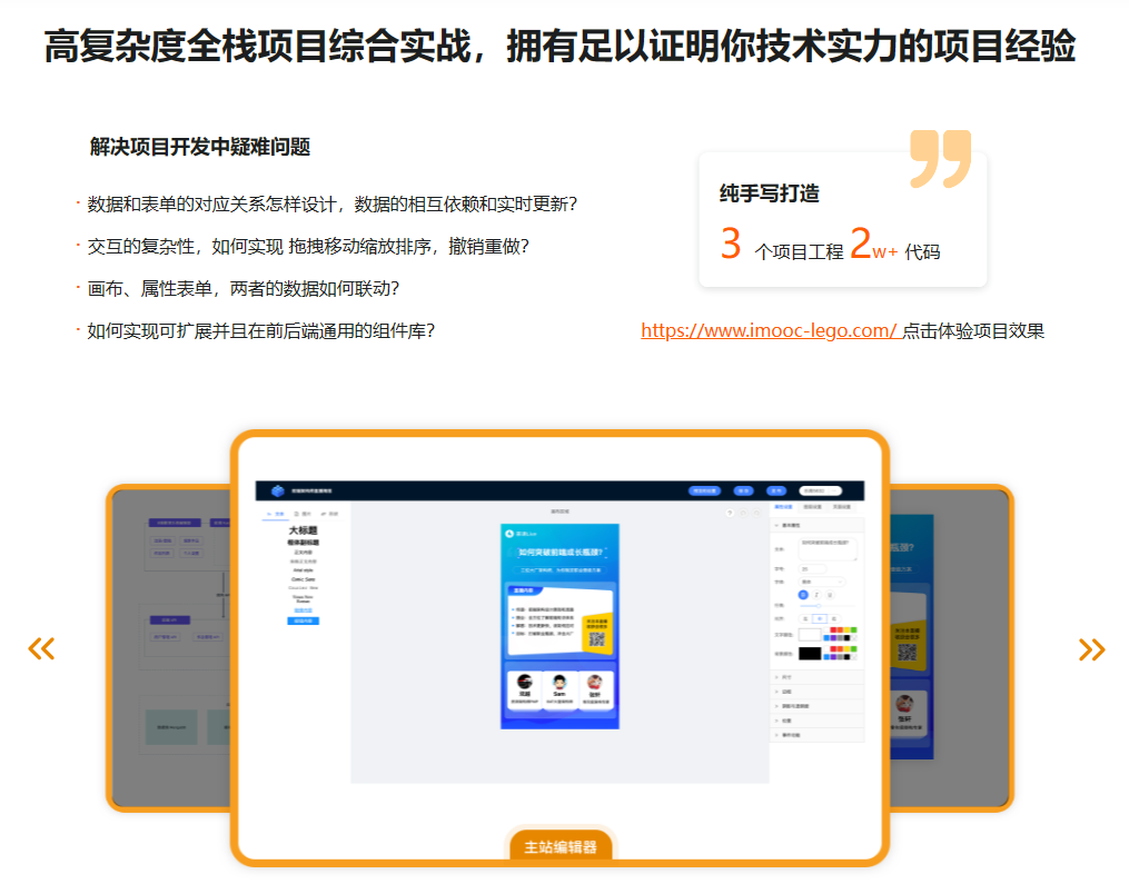 在互联网就业形式越来越严峻的今天,掌握多项具有强竞争力的技能非常重要。做一个有完整流程闭环并且有深度有广度的真实项目,可以完美适配这个需求。在这门课程中,我们用最新的技术栈实现了三个独立的项目:前端低代码海报编辑器、后端 egg.js + TS、使用 Nuxt3实现管理系统,最后从 Docker 部署到 CI/CD 的整个流程,最后完美闭环实现一个线上运行的真实项目。大幅提升自己的全栈以及架构能力。
