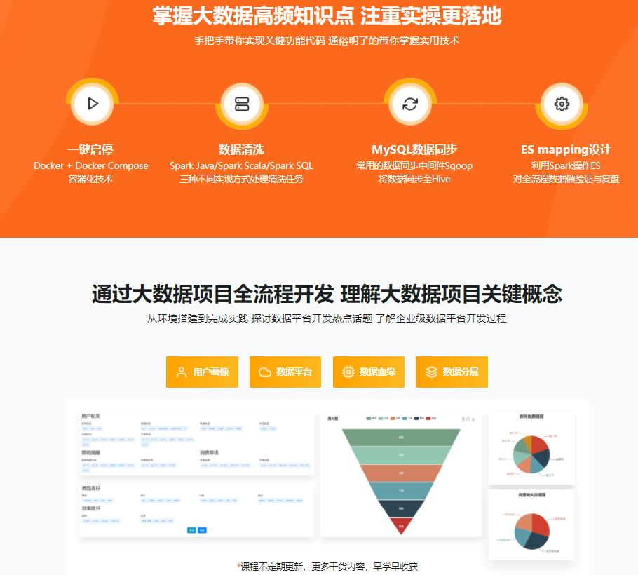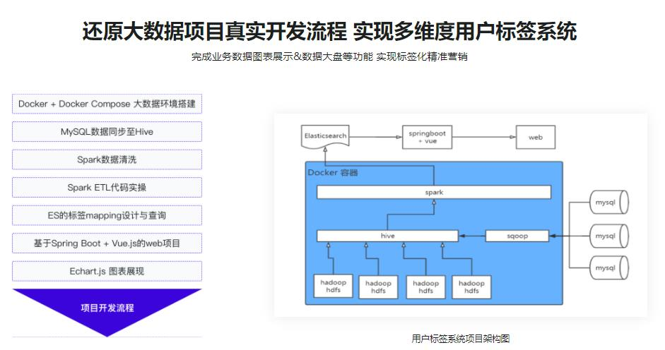 课程利用 Spark + ElasticSearch 构建用户标签系统,利用 Docker+Docker Compose 实现项目的一键启停。涵盖数据同步、数据清洗、用户标签化等步骤,带你领略企业级数据平台的开发流程。